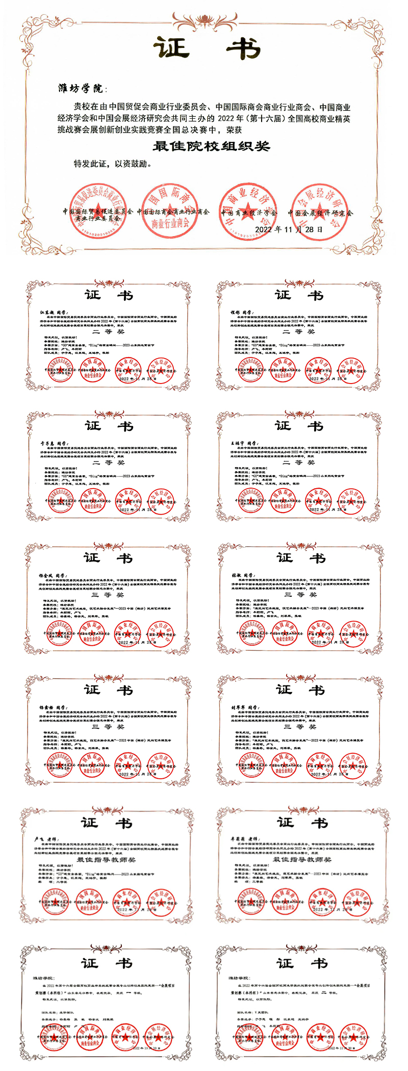 近日,由中國國際貿易促進委員會商業行業委員會、中國國際商會商業行業商會、中國會展經濟研究會和中國商業經濟學會共同主辦,中國貿促會商業行業委員會教育培訓部、中國會展經濟研究會會展教育培訓工作委員會、教育部會展策劃與管理專業教學資源庫承辦的2022年全國第十六屆全國高校商業精英挑戰賽會展創新實踐競賽總決賽在線上舉辦。文史學院(文化與旅游學院)旅游管理專業學生于子慧、江東超、王鴻宇、程彤參與的《“GO”建黃金盛宴,“Ding”格黃金瞬間——2023山東招遠黃金節》榮獲會展項目策劃類國賽二等獎,學生楊鑫格、楊金鳳、劉翠翠、張敏參與的《“展民間藝術瑰寶,促藝術融合發展”——2023中國(濰坊)民間藝術博覽會》榮獲會展項目策劃類國賽三等獎的好成績,我校榮獲最佳院校組織獎,盧飛、牟莉莉榮獲最佳指導教師獎,全國高校商業精英挑戰賽會展創新創業實踐競賽是全國普通高校大學生競賽排行榜榜單賽事之一,已成為我國會展教育領域中,院校覆蓋全面、校企合作深入、國際交流廣泛的賽事活動,形成了集學科競賽、產學合作與國際交流三位一體的創新實踐平臺。本屆大賽于2022年3月正式啟動,經院校推薦、省賽選拔、國賽組委會評審,最終來自全國306所高校1178支參賽隊伍入圍總決賽。我校旅游管理專業2支參賽隊分別以山東省賽一等獎和二等獎的出色成績進入全國總決賽,并在知識賽、參賽文案撰寫、項目介紹、視頻制作、在線答辯的競賽環節中,展現出了優異的專業素養,榮獲佳績。