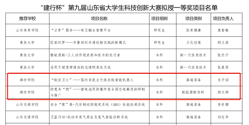 本網訊 近日,由山東省教育廳主辦的“建行杯”第九屆山東省大學生科技創新大賽決賽,在山東農業大學落下帷幕。經過激烈角逐,我校物理與電子信息學院項目”‘軌安衛士’——國內首款全天候在軌智能機器人”(項目負責人宋子詔)、化學化工與環境工程學院項目”防患未‘燃’——鋰電池用防爆炸復合固態電解質的研制與推廣“(項目負責人顏文卿)榮獲一等獎。