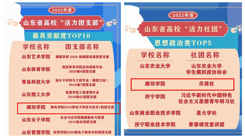 本網訊 近日,在2022年度山東省高校“活力團支部”“活力社團”風采展示活動中,我校物理與電子信息學院2019級電子科學與技術1班團支部成功入選山東省高校“活力團支部”最具貢獻度TOP10榜、盡美社成功入選山東省高校“活力社團”思想政治類TOP5榜。