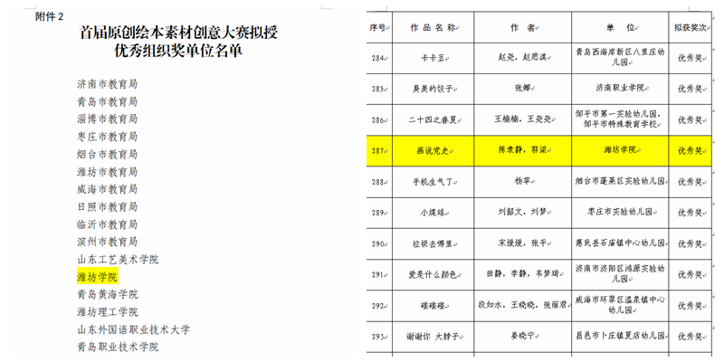 本網訊 近日,由山東省學前教育中心主辦的首屆山東省原創繪本素材創意大賽在山東省教育廳網站公布了擬獲獎名單,我校美術學院教師陳隸靜、郭梁的作品《畫說黨史》獲優秀獎,學校獲評20個優秀組織獎之一。