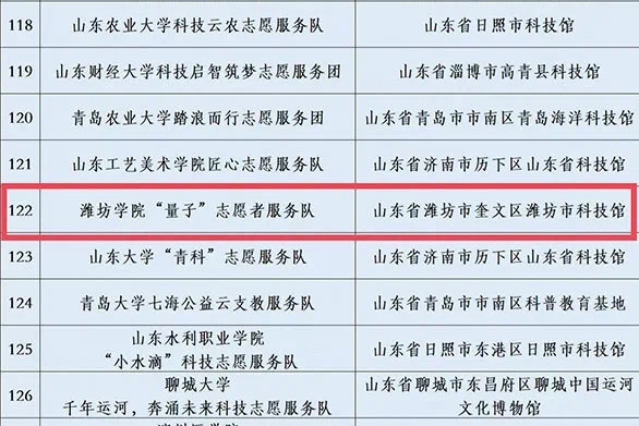 本網訊 近日,“2022年全國大學生科技志愿服務示范團隊”入選名單公布,全國300支團隊入選。我校物理與電子信息學院“量子”志愿者服務隊位列其中。