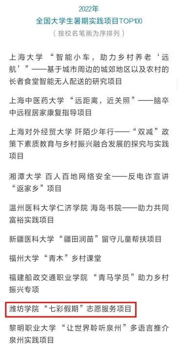 本網訊 近日,由中國青年報社主辦的“2022年第八屆全國大學生暑期實踐展示活動”評選結果出爐,經過高校推薦、團隊自薦、網絡展示等環節,我校“七彩假期”志愿服務項目入選全國大學生暑期實踐項目TOP100。
