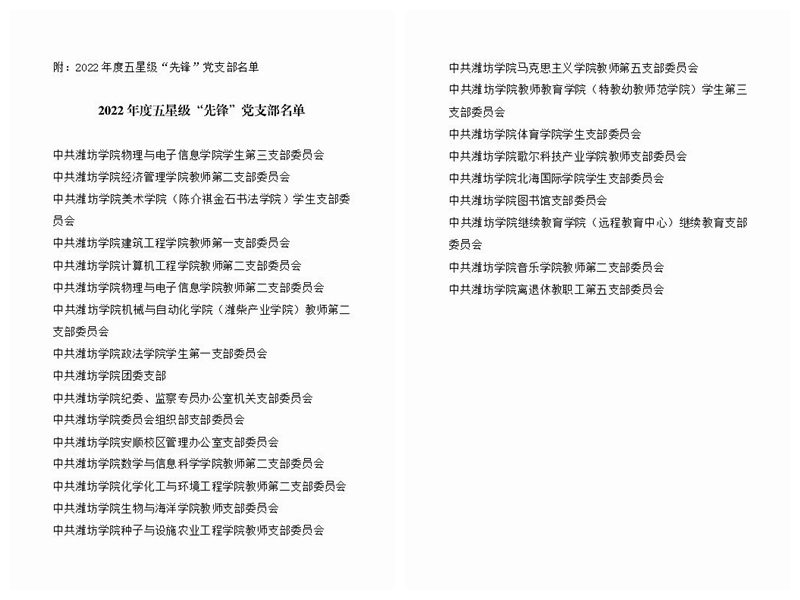本網訊 近日,濰坊市委教育工委印發《關于命名五星級“先鋒”黨支部的通報》,經黨支部自評、學校黨委考評和市委教育工委復核,決定命名153個黨支部為2022年度市委教育工委五星級“先鋒”黨支部,其中我校物理與光電工程學院學生第三黨支部等25個黨支部被命名為五星級“先鋒”黨支部。