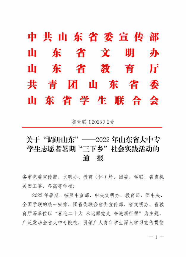 本網訊 日前,省委宣傳部、省文明辦、省教育廳、團省委、省學聯公布了《關于“調研山東”——2022年山東省大中專學生志愿者暑期“三下鄉”社會實踐活動的通報(魯青聯〔2023〕2號)》,我校喜獲59項集體和個人表彰榮譽。