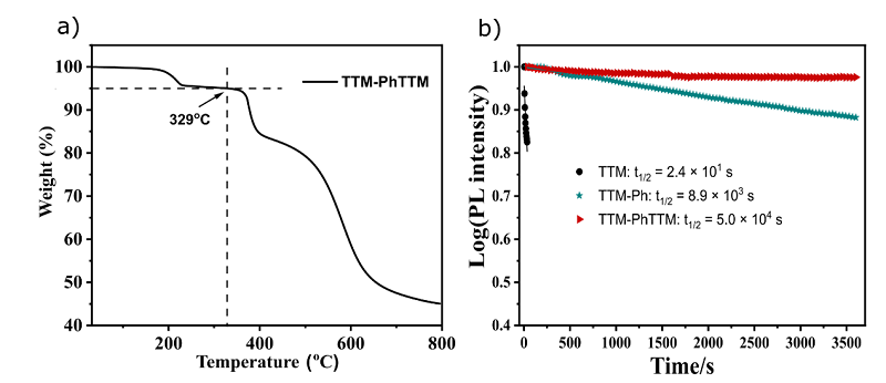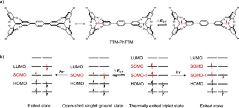 該論文首次報道了具有發光性質的凱庫勒(Kekulé)雙自由基TTM-PhTTM。實驗和理論計算結果表明,TTM-PhTTM具有開殼單線態基態,雙自由基特征為90%。由于其單線態-三線態能隙較小,開殼單線態基態可以被熱激發為三線態(圖1)。在室溫條件下,TTM-PhTTM在各種溶劑中具有深紅光發射。TTM-PhTTM還具有較高的熱穩定性和光穩定性,在光電子和磁學方面顯示出巨大應用潛力。