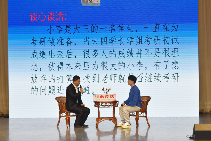 本次輔導員風采展示分為談心談話和主題班會兩個環節。在談心談話環節,5位專兼職輔導員圍繞輔導員九大職責,結合輔導員日常工作,采用貼合學生學習與生活的案例,從學生思想理論教育和價值引領、學生日常事務管理、大學生心理健康教育、職業規劃與就業創業指導等方面還原學生學習、成長中遇到的問題。面對一個個難題,演職人員傾情演出,演繹角色到位;輔導員們沉著應對,以良好的精神面貌、過硬的心理素質以及充足的知識儲備,找到問題本質,并結合工作實踐經驗,還原真實談話過程,給出合理的解決方式和建議,開出一劑又一劑“良方”。