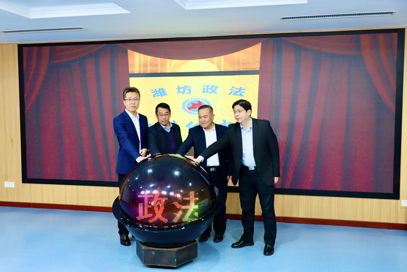 儀式上觀看了濰坊政法融媒體中心介紹片;馬向東、單振濤、田義明、牟朋飛共同為濰坊政法融媒體中心揭牌;傳媒學院負責同志代表學校與市委政法委簽訂了大學生就業實習基地建設合作協議并為其授牌。