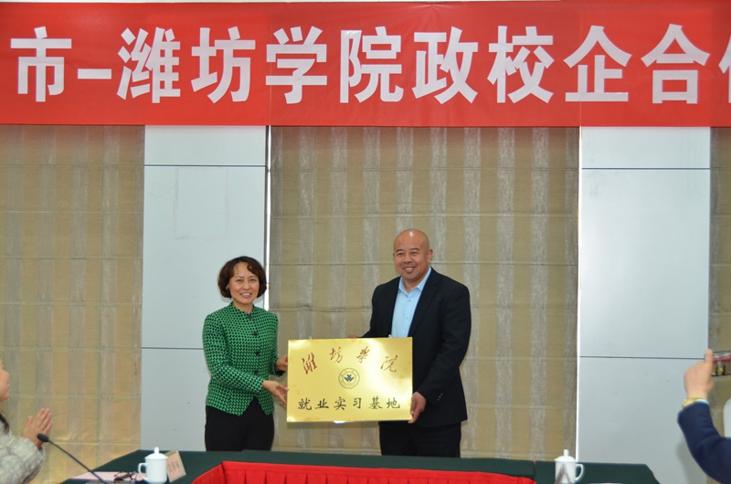經濟管理學院負責同志代表學校與壽光7家企業簽訂了就業實習基地建設及相關教科研合作協議。徐梅為簽訂協議的企業授牌。