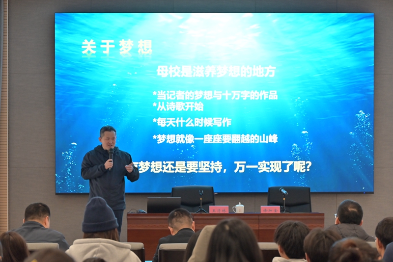 王清林以《讓夢想驅動成長——與即將畢業的大學生朋友談創業與成長》為題,從“關于夢想、關于創業、關于成長”三個維度,分享了自己在母校求學時的多方面鍛煉、在記者崗位上10年的成長積累、在激情創業歷程的拼搏奮斗。王清林鼓勵同學們要堅持夢想、努力奮斗,保持持續學習的態度和勇于擔當的品格,既憧憬未來,也要活在當下,讓夢想驅動自己不斷成長。