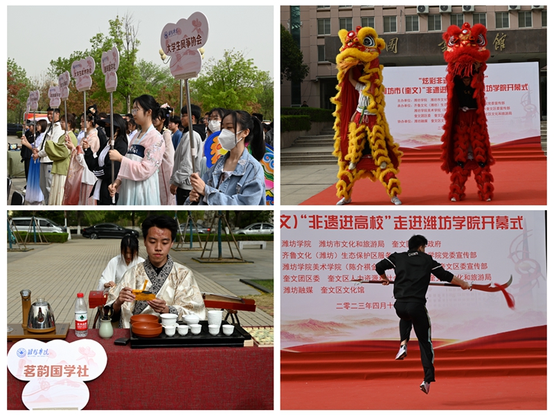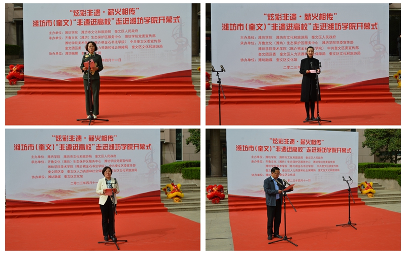 本次活動由濰坊市文化和旅游局、奎文區人民政府和濰坊學院主辦,齊魯文化(濰坊)生態保護區服務中心、濰坊學院黨委宣傳部、濰坊學院美術學院(陳介祺金石書法學院)、中共奎文區委宣傳部、奎文團區委、奎文區人力資源和社會保障局、奎文區文化和旅游局承辦,濰坊融媒、奎文區文化館協辦。根據活動安排,炫彩非遺·薪火相傳”濰坊市(奎文)“非遺進高校”將在我校組織開展7場公益講座和培訓,組織學生到濰坊非遺聚集區、傳承基地、非遺工坊進行研學體驗,讓廣大師生認識優秀傳統文化的技藝之美、匠心之美,增強對中華優秀傳統文化的理解和認同。