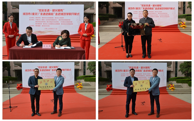奎文區政府與濰坊學院簽署了文化發展戰略合作協議。齊魯文化(濰坊)生態保護區服務中心相關負責人授予美術學院(陳介祺金石書法學院)“濰坊市非物質文化遺產傳承教育實踐基地”牌匾;美術學院(陳介祺金石書法學院)負責同志授予奎文區文化館“濰坊學院教學實踐基地”牌匾,授予山東謙和文化傳媒有限公司“濰坊學院就業實習基地”牌匾。
