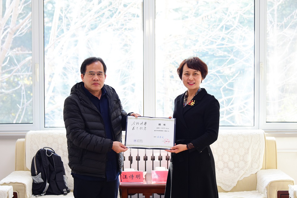 徐梅代表學校對汪詩明教授的來訪表示歡迎。她介紹了學校的發展歷程、人文社科領域的科研成績,希望汪詩明教授一如既往地支持學校人文社科研究工作,并頒發學校客座教授聘書。