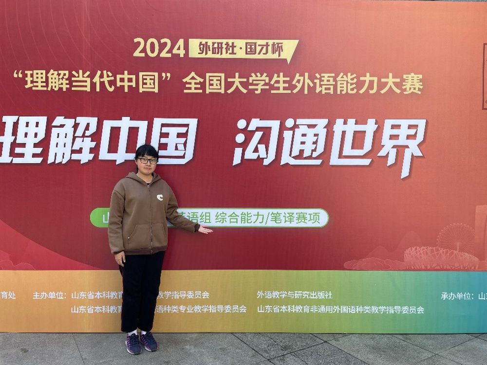 我校選手韓雨珊在楊琳、韓偉偉和王瑩雪老師的指導下,從全省146名選手中脫穎而出,獲得筆譯賽項省賽金獎,并與來自包括山東大學、中國海洋大學、山東師范大學等重點院校的11位選手共同代表我省參加國賽。國賽考查選手對不同文體語篇特點的把握和相關翻譯策略的靈活運用,鼓勵大學生提升人工智能時代與新媒體時代所需的國際傳播能力,成為胸懷祖國、業務精湛、融通中外的優秀翻譯人才。大賽得到了社會各界的持續關注和支持,在推動外語教育教學改革中發揮了重要引領作用。