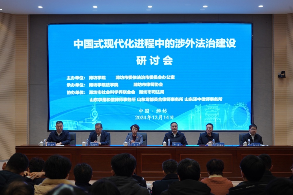 本網訊 12月14日,“中國式現代化進程中的涉外法治建設”研討會在學校召開。學校黨委書記徐梅,濰坊市副市長、市公安局黨委書記、局長郝建出席并致辭。學校黨委委員、副校長李英德主持會議。學校黨委委員、副校長苗金春,濰坊市委依法治市辦副主任,市司法局黨委書記、局長張志強出席會議。會議邀請山東省司法廳原副廳長、一級巡視員朱曉峰,大連海事大學法學院教授、博士生導師、黃渤海研究院院長張晏瑲作主旨報告。