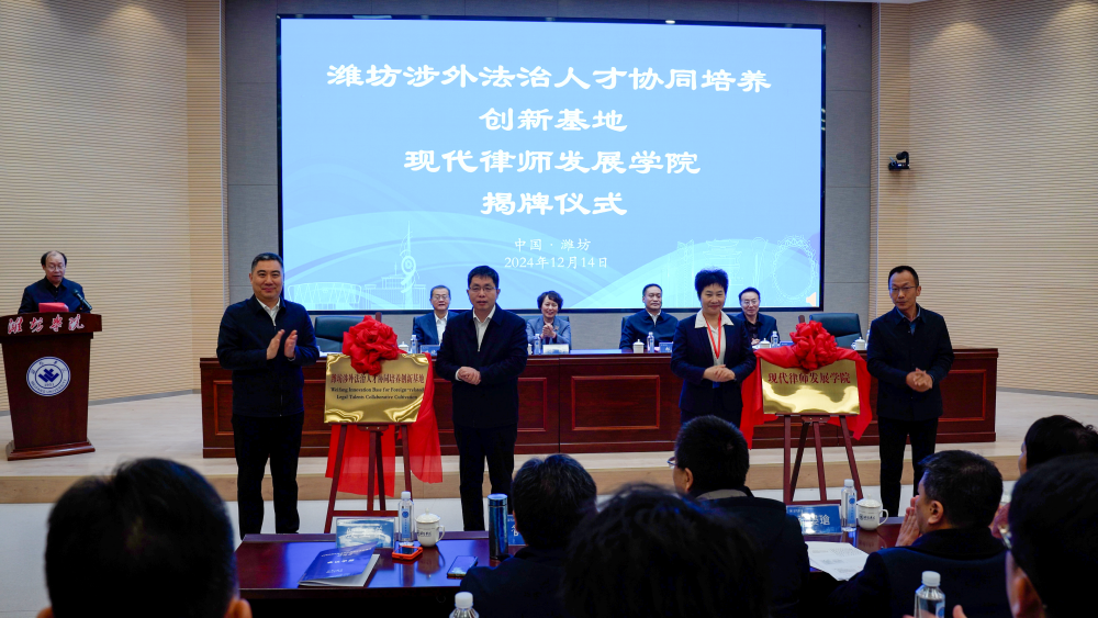 苗金春、張志強共同為“涉外法治人才協同培養基地”揭牌。濰坊市法學會副會長夏壽巖,濰坊市司法局黨委委員、副局長、市律師行業黨委書記殷玉萍共同為“現代律師發展學院”揭牌。