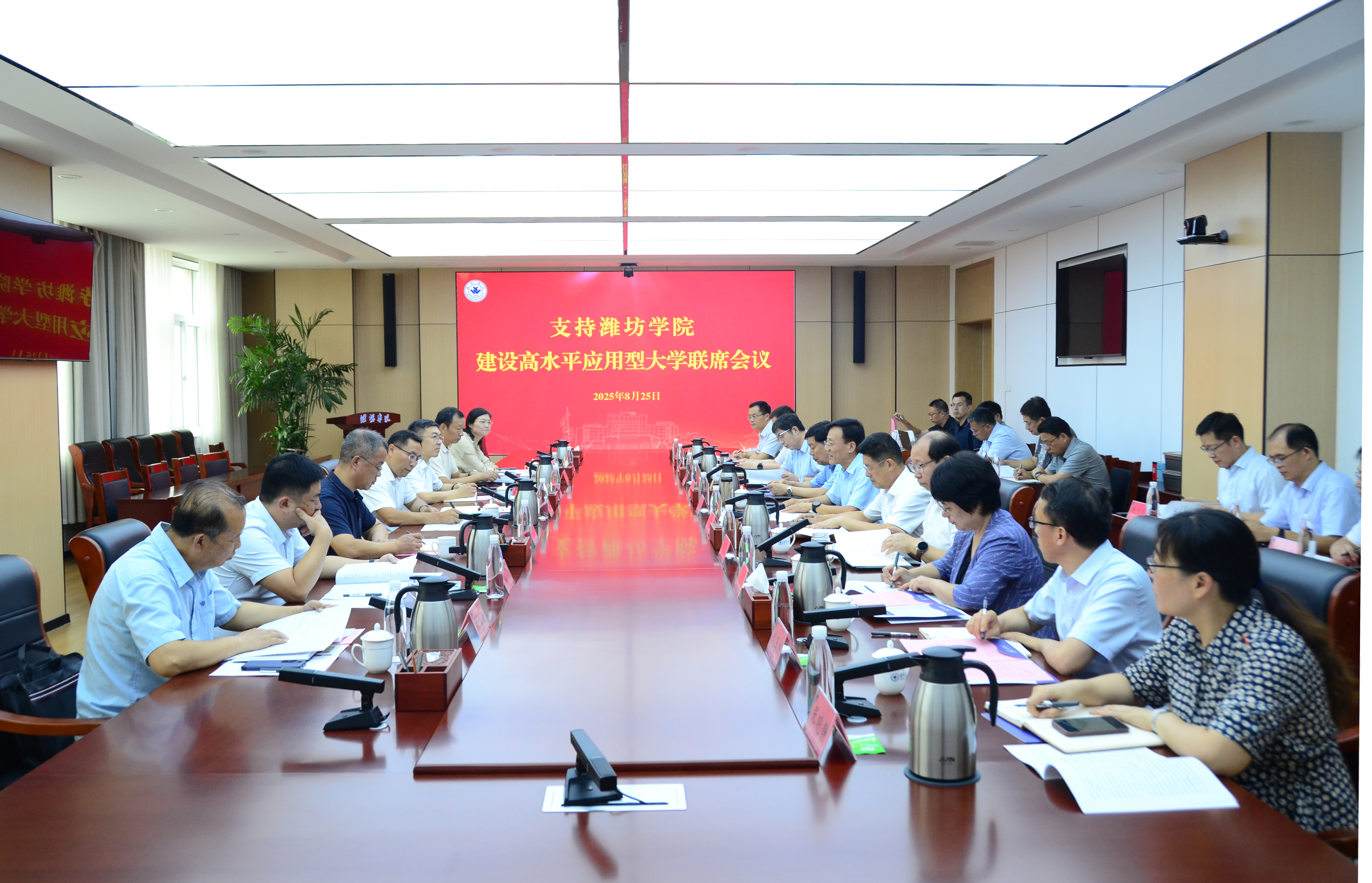 本網訊 濰坊市委、市政府支持濰坊學院建設高水平應用型大學第一次聯席會議于8月25日在學校召開。副市長馬勇出席會議并講話,校黨委副書記、校長來逢波主持會議。市政府副秘書長王繼東,市教育局、市科技局、市工信局、市財政局、市人社局分管負責同志,校黨委班子成員參加會議。