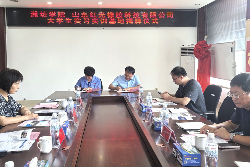 揭牌儀式上,張建偉與代輝共同為實習實訓基地揭牌。機械與自動化學院副教授劉英杰與山東紅光橡膠科技有限公司總經理單麗麗簽署技術顧問協議,雙方將圍繞橡膠材料研發、智能制造工藝優化等方向展開聯合技術攻關。