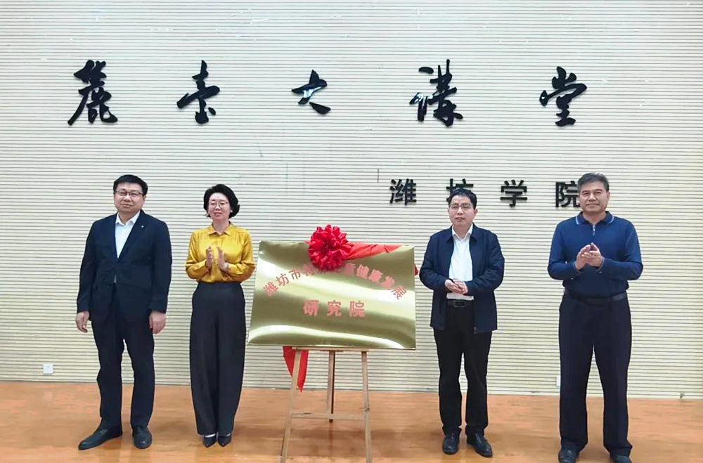 苗金春與濰坊市殘疾人聯合會黨組書記、理事長王妍妮,濰坊市教育局黨組成員、副局長宋炳華,濰坊市衛生健康委員會計劃生育協會二級調研員張新軍為研究院揭牌。
