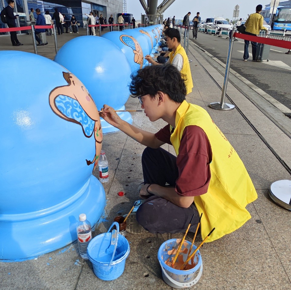 9月26日至28日,濰坊學院美術學院“七色花”大學生志愿服務隊、盡美社及大學生書畫社團的志愿者,分赴濰坊站、濰坊北站開展主題創作。志愿者以“濰坊象”為元素,手持畫筆從線稿勾勒到色彩填充,歷時3天完成90余個石墩的繪制。畫中“濰坊象”形象親切可愛,既承載著“濰坊有象,萬象更新”的寓意,更將濰坊熱情、開放、友好的城市氣質融入筆觸,讓靜態石墩成為傳遞城市文化的“活載體”。
