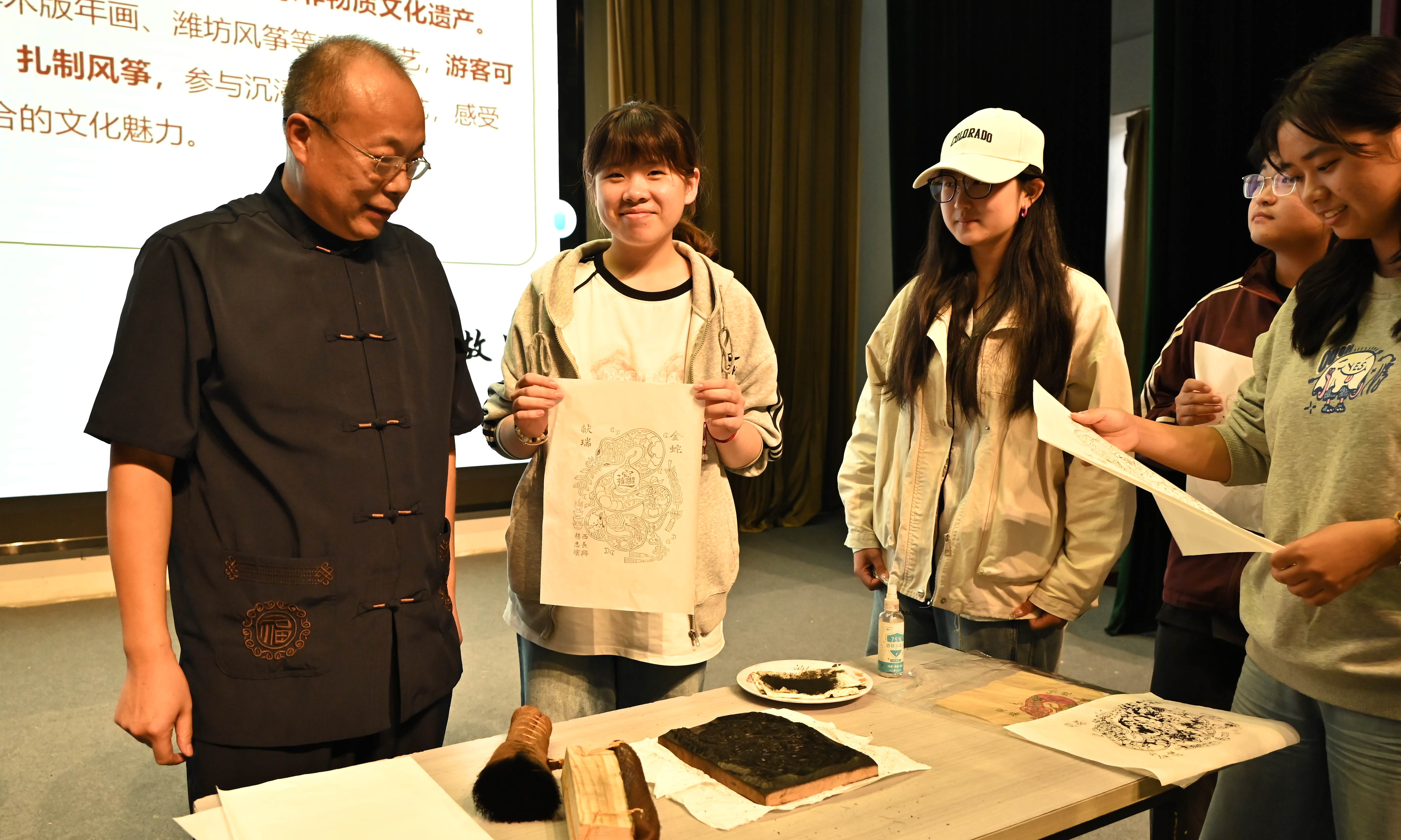 活動現場,風箏省級非遺傳承人郭洪利現場講解風箏的歷史與發展,展現傳統技藝的創新實踐。楊家埠木版年畫傳承人楊志濱講解木版年畫的歷史淵源及藝術特色,現場示范并指導同學們進行年畫線稿印制。通過互動體驗,學生們耳濡目染鄉土文化,讓非遺傳承從“小眾堅守”變為“大眾參與”。活動現場還為同學們贈送經典楊家埠木版年畫信封及迷你沙燕風箏。