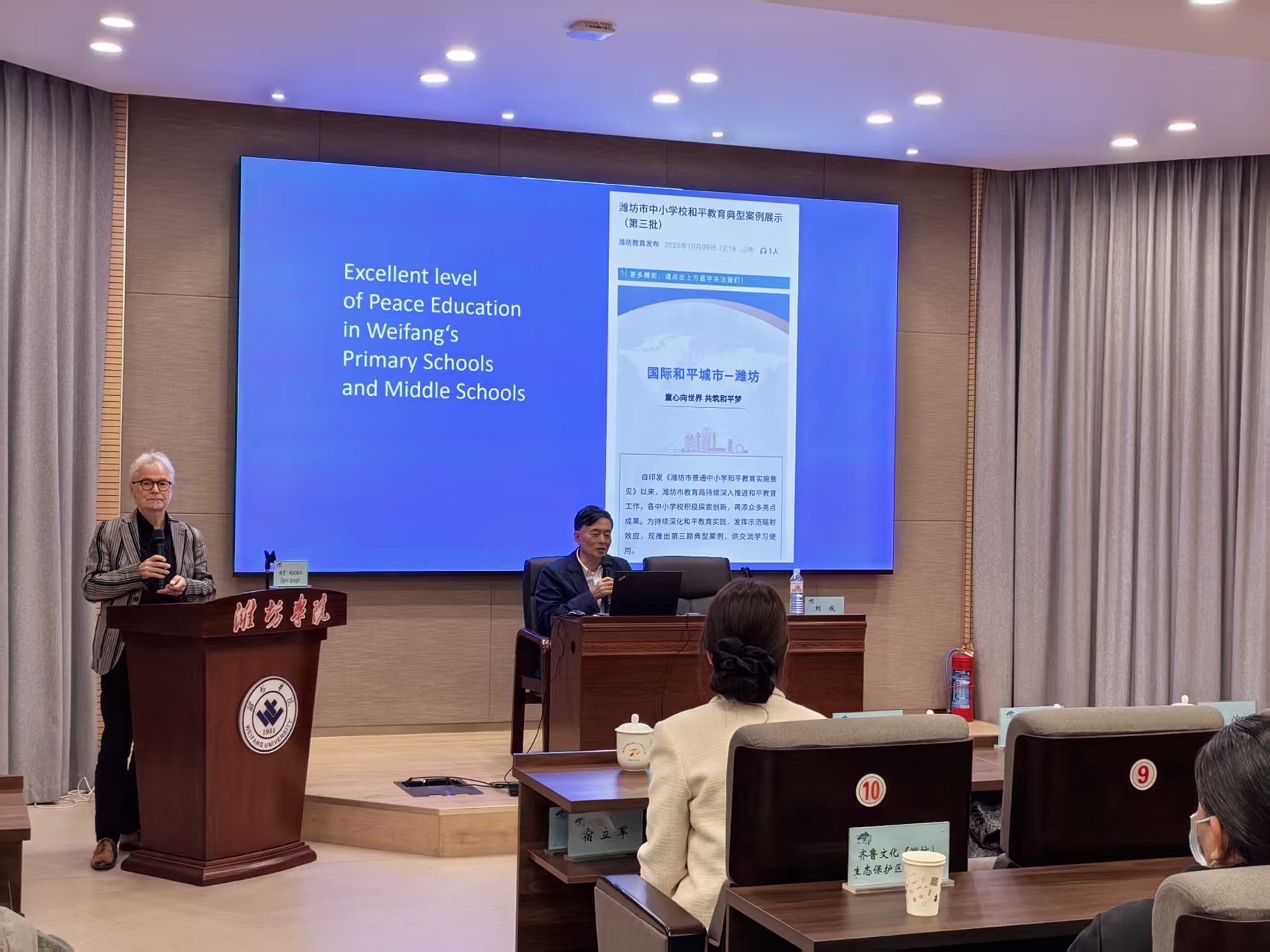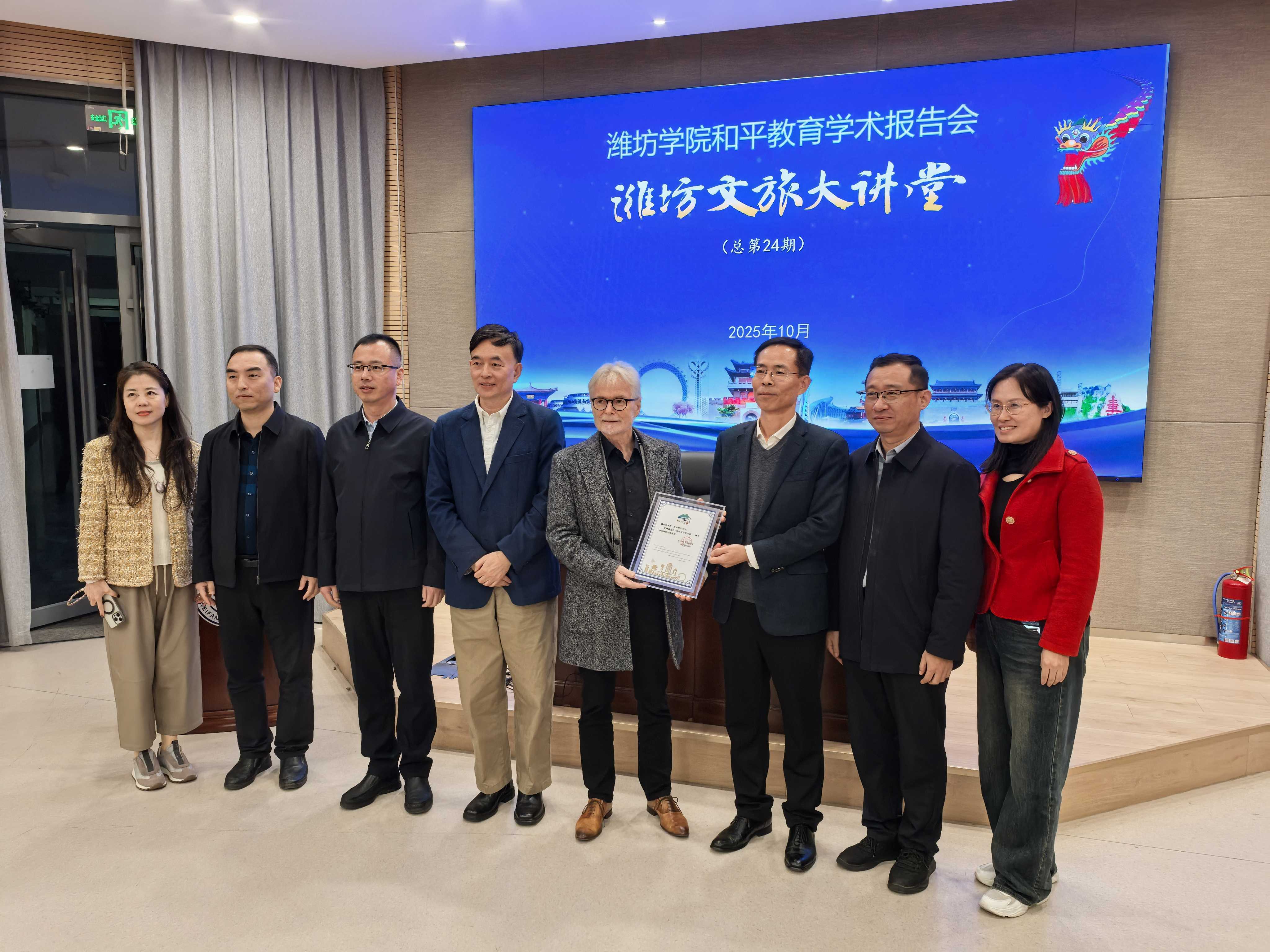 會上,劉成以《國際和平城市建設的理念與行動》為題,系統闡釋了和平教育的內在邏輯與時代價值;埃貢?施皮格爾從德國和平教育的實踐出發,強調和平教育已與學校整體育人環境、辦學理念深度融合,對校園氛圍乃至社會風氣具有深遠影響。隨后,施皮格爾教授受聘為“濰坊文旅推介官”。