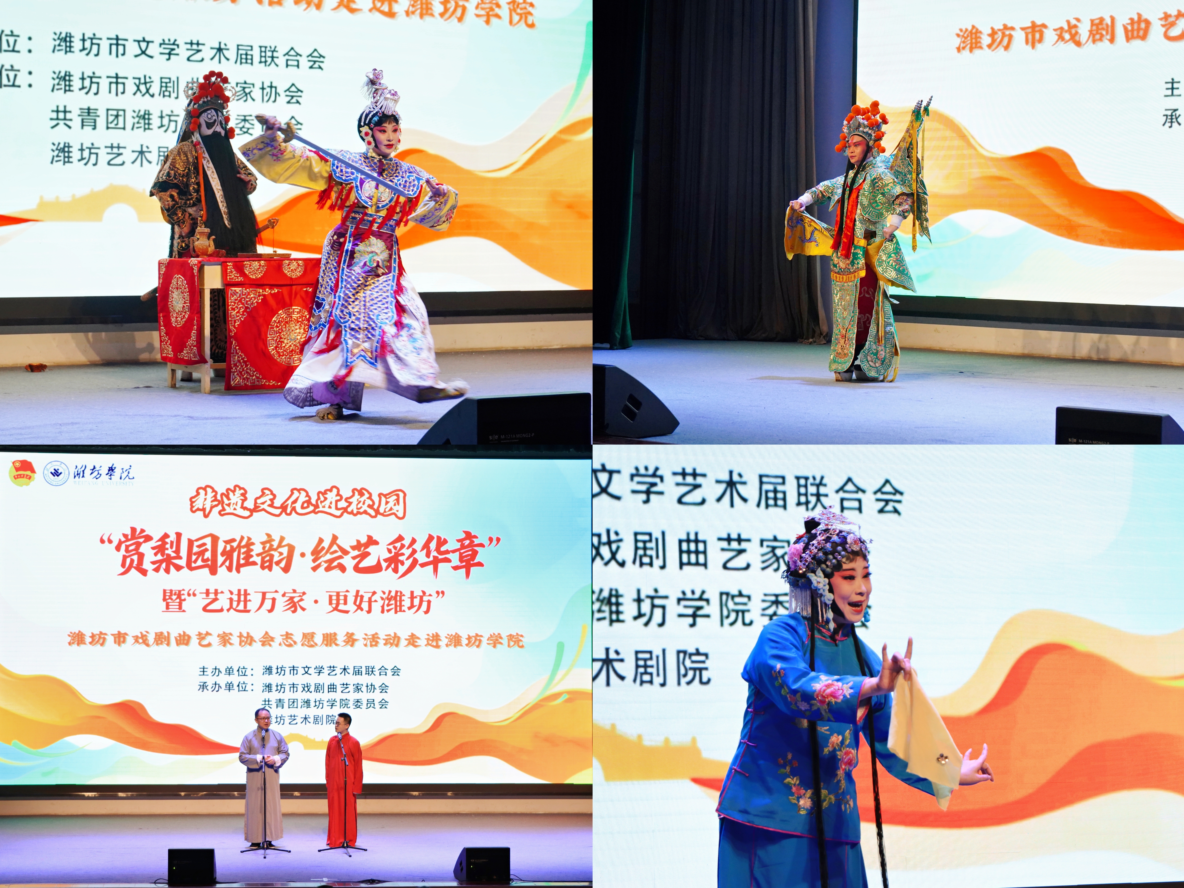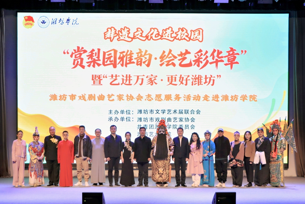 本網訊 10月27日,非遺文化進校園“賞梨園雅韻·繪藝彩華章”暨“藝進萬家·更好濰坊”濰坊市戲劇曲藝家協會志愿服務活動在學校圖書館報告廳舉行。學校黨委委員、副校長任立春,濰坊市文聯黨組成員、副主席邱兆鋒,濰坊市戲劇曲藝家協會主席劉淑娟,濰坊藝術劇院總經理富榮,濰坊市戲劇曲藝家協會副主席李全忠、張華出席活動。