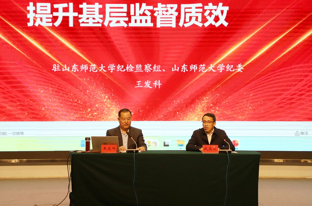 會上,省紀委監委駐山東師范大學紀檢監察組副組長、山東師范大學紀委副書記王發科圍繞貫徹落實全面從嚴治黨主體責任、做好職能監督、專責監督的方法路徑與案例實踐等方面作專題輔導報告。報告前,全體與會人員觀看了警示教育片。
