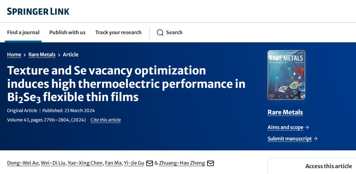 論文“Realizing high power factor in p-type BiSbTe flexible thin films via carrier engineering” 被Rare metals接收。研究采用磁控共濺射和熱擴散技術,成功制備了高性能p型BiSbTe柔性薄膜,通過精確的載流子工程優化了載流子濃度和遷移率,實現了室溫下高達24.13 μW cm?1 K?2的功率因子,展示了在柔性熱電發電領域的應用潛力。