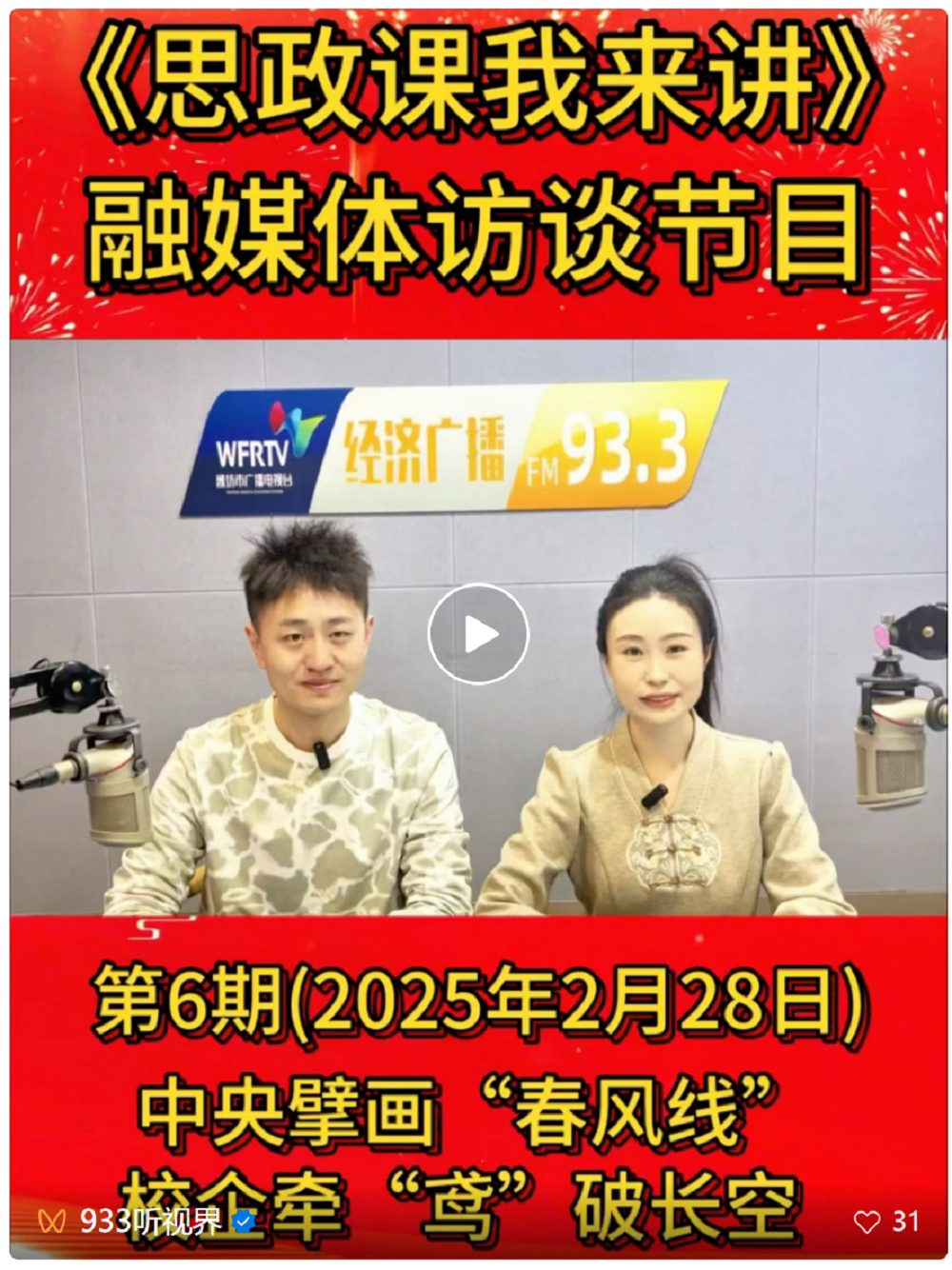 本網訊 近日,馬克思主義學院教師劉亞男應邀錄制的《思政課我來講》節目在濰坊廣播電視臺經濟廣播頻道播出。