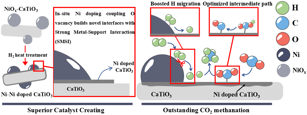 論文針對常規CO?甲烷化反應過程需在高溫、高壓力條件下運行,才能獲得工業級轉化率、反應速率和選擇性。開發出一種Ni/CaTiOx/CaTiO3四高一體光熱催化劑,常壓溫和條件下,通過光熱催化技術實現高CO?轉化率(約87%)、高CO?催化速率(3.12 mol gNi-1h-1)、高穩定性、高CH4選擇性(約100%)的四高活性。同時研究揭示了金屬/氧化物負載型催化劑,易被大家忽略的金屬摻雜的重要性。