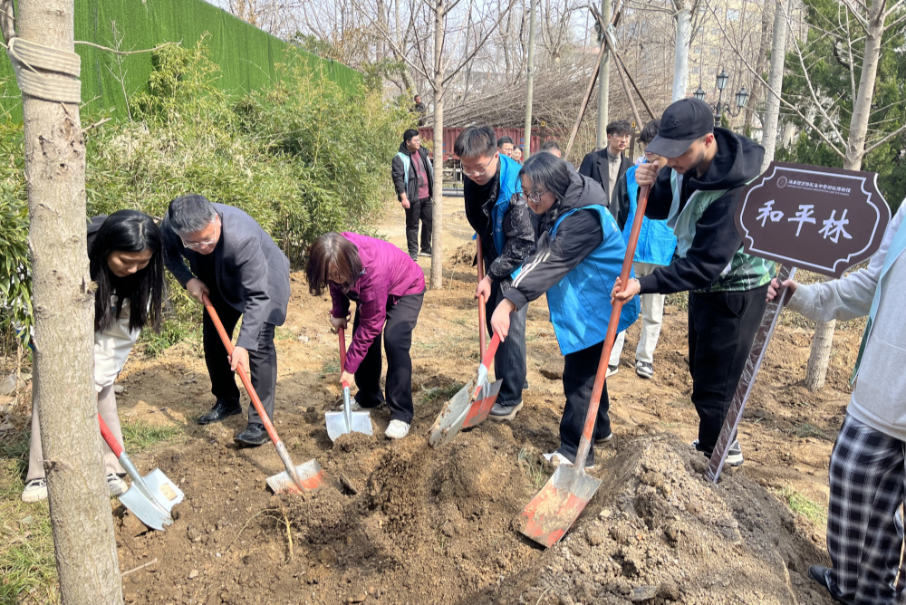 中外學生手持鐵鍬、水桶等工具,分組協作,在工作人員的指導下齊心協力,挖坑、栽樹、填土、澆水,投入到緊張而有序的植樹活動中。植樹過程中,不同膚色、不同語言的學生相互交流、互相幫助,現場氣氛熱烈而融洽。大家用實際行動詮釋著對和平的共同追求,也在合作中增進了彼此之間的友誼。植樹結束后,學生們在自己栽種的樹苗上系上寫有祝福話語的心愿簽,不同語言寫就的卡片表達著對和平的美好期許。