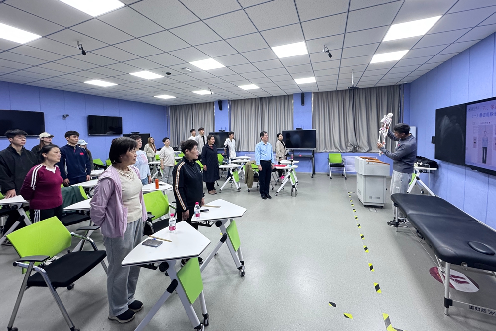 活動由體育學院副教授李瑞軍擔任主講。講座中,李瑞軍針對退休教師常見的脊柱側彎、圓肩駝背、骨盆前傾等體態問題,以通俗易懂的語言解析成因及危害,強調 “預防優于治療” 理念,指出體態失衡是慢性疼痛的重要誘因,科學評估與針對性訓練可有效改善生活質量。他還借助人體模型,直觀展示關節活動度與健康的關聯,讓理論知識更易理解。