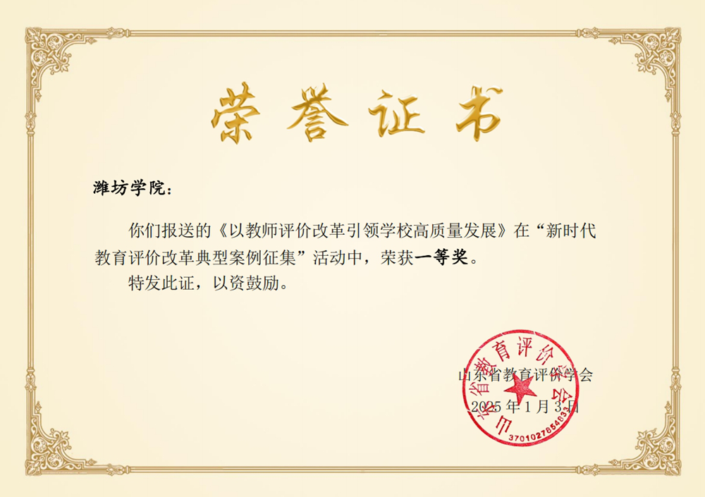 本網訊 近日,山東省教育評價學會官網公布了山東省新時代教育評價改革典型案例遴選結果,經各單位推薦和專家評審,共評選出一等獎20項、二等獎40項。我校《以教師評價改革引領學校高質量發展》案例榮獲一等獎。