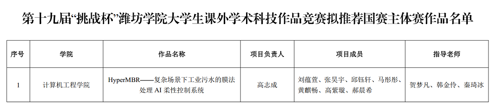 根據團省委《關于報送第十九屆“挑戰杯”全國大學生課外學術科技作品競賽項目的工作提示》要求,擬推薦作品《HyperMBR——復雜場景下工業污水的膜法處理AI柔性控制系統》參加國賽主體賽,現予以公示。