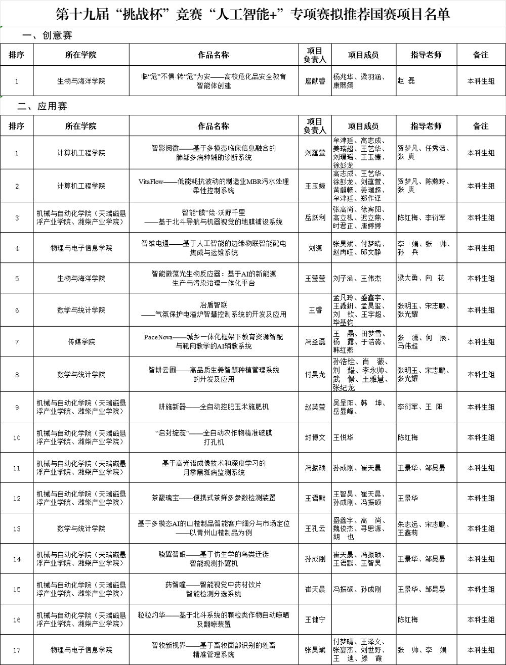 根據團省委《關于報送第十九屆“挑戰杯”全國大學生課外學術科技作品競賽項目的工作提示》要求,擬推薦《智影閱微——基于多模態臨床信息融合的肺部多病種輔助診斷系統》等作品參加國賽,現予以公示。