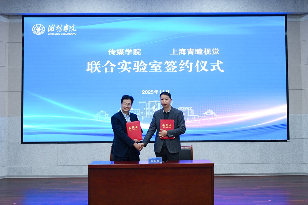 與會領導嘉賓共同啟用“濰坊學院數字創意與融媒體協同創新平臺”。趙加強為平臺指導教師頒發聘書。傳媒學院負責同志與上海青瞳視覺有限公司教育事業部總經理許航簽訂數字表演技術開發聯合實驗室合作協議,并作表態發言。