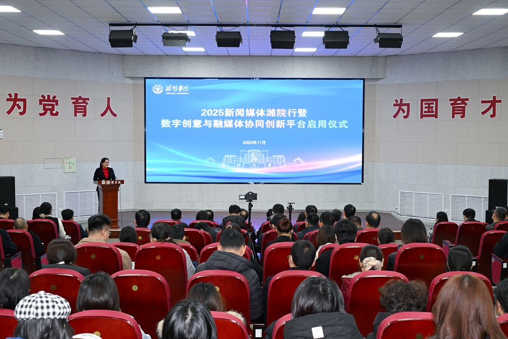 本網訊 11月18日,學校舉行2025新聞媒體濰院行活動暨數字創意與融媒體協同創新平臺啟用儀式。學校黨委書記來逢波、山東省教育廳辦公室副主任諸葛佳琳出席儀式并致辭,光明日報山東記者站站長宋喜群,科技日報山東記者站站長王延斌,中國青年報山東記者站站長邢婷,山東廣播電視臺教育工作室主任莊紅,大眾日報濰坊記者站站長王佳聲,濰坊市融媒體中心主任、濰坊傳媒集團黨委書記、董事長劉瑩有,濰坊市文化和旅游局黨組書記、局長高強,濰坊市新時代文明實踐中心主任韓國鵬,省領導干部考試題庫中心副主任崔建亮,學校黨委委員、組織部部長趙加強出席活動。黨委委員、宣傳部部長張曉靜主持活動。