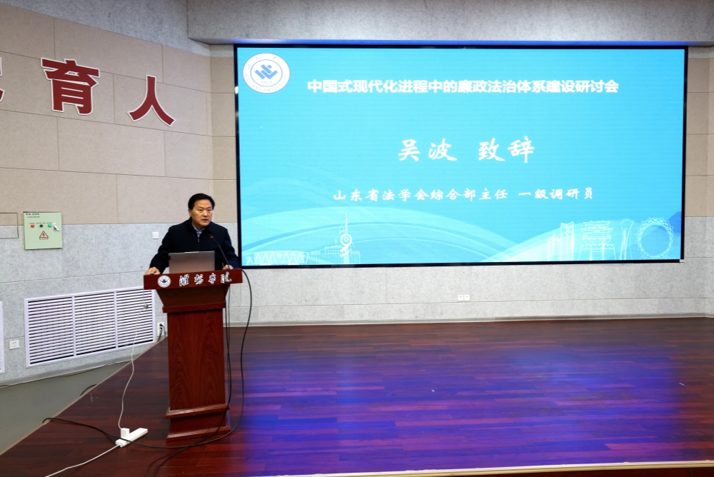 本網訊    12月27日,“中國式現代化進程中的廉政法治體系建設”研討會在學校召開。山東省法學會綜合部主任、一級調研員吳波出席開幕式并致辭。濰坊市委常委、市紀委書記、市監委主任田兵兵,濰坊市委政法委副書記、市法學會黨組書記、常務副會長李春野,濰坊市社科聯黨組書記、主席李磊,學校黨委書記來逢波,黨委委員、副校長、紀檢監察研究院院長苗金春,黨委委員、紀委書記、監察專員武玉杰等出席會議。