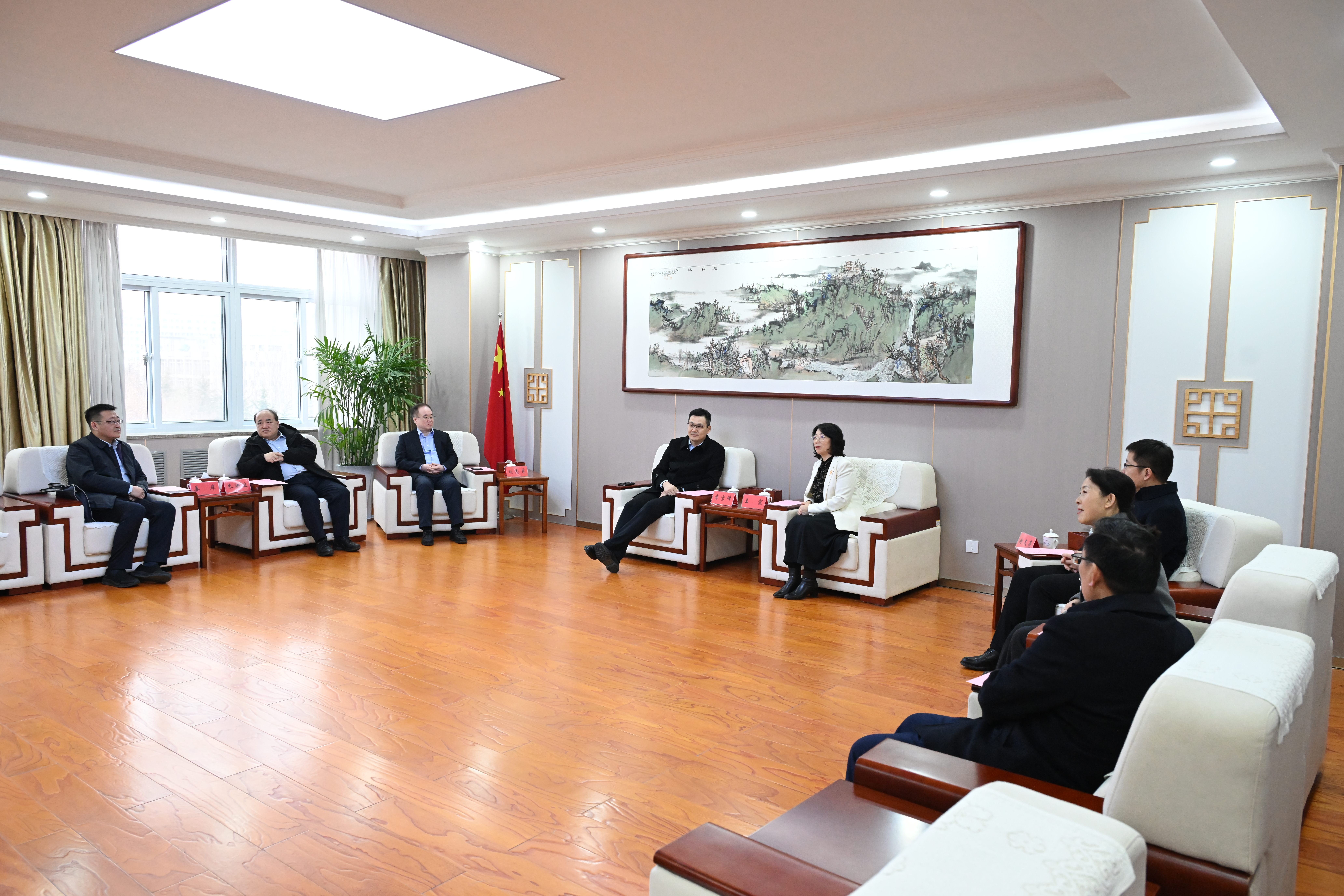 王霞代表學校對袁雪峰一行表示歡迎,并簡要介紹了學校的基本情況、發展路徑和未來規劃。她表示,長期以來雙方建立了良好戰略合作關系,擁有深厚的合作基礎和廣闊的發展空間,希望雙方進一步深化多領域合作,實現互利共贏。